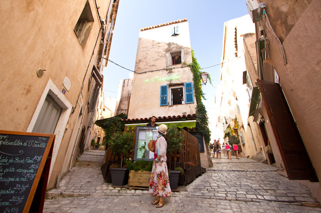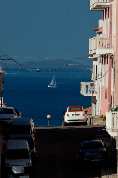 來到薩丁尼亞島最北端的海港S. Teresa Gallura,為的是搭船到隔個小海峽的薩丁尼亞北方法屬科西嘉島。薩丁尼亞和科西嘉像兩棵珍珠南北串成一線,正正在碧藍地中海的中央閃耀著綠光。抵達S. Teresa Gallura的瞬間才知道,駕著手排車到此對我們而言是一大考驗,因為此海港城路窄而坡陡,有將山城和海港城特色合而為一之妙,臨港的一面,每條路都像下圖一般:像是直直往碧海藍天衝下去。手排車在此上上下下外加路邊停車,在美妙悠閒的港灣景色陪伴下,為旅人們徒增了一絲絲小小驚駭。除去路窄而坡陡之挑戰,乘船往科西嘉島的港口與我們初達的港口並不相臨,在毫無路標的情況下,靠著當地人開車領我們越過城頂下山到另一側並通過海底隧道,才找到正確的渡輪港口。薩丁尼亞當地居民對遊客相當的友善,此行多次獲得島民親切領路和提供寶貴資訊。